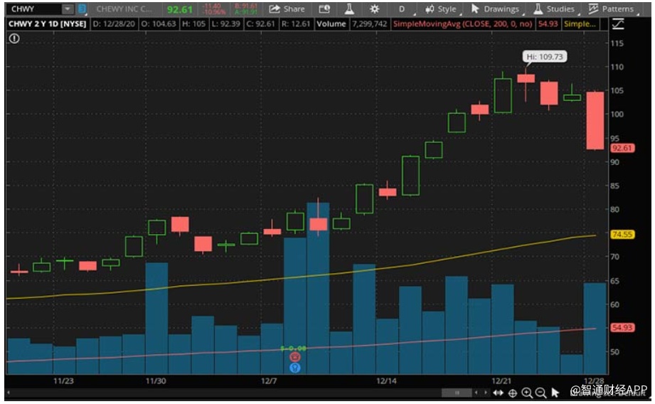 Chewy是一家宠物食品及其他相关产品的在线零售商,总部设在佛罗里达州。年初至今,该股的股价已经上涨了200%,市值近400亿美元。
