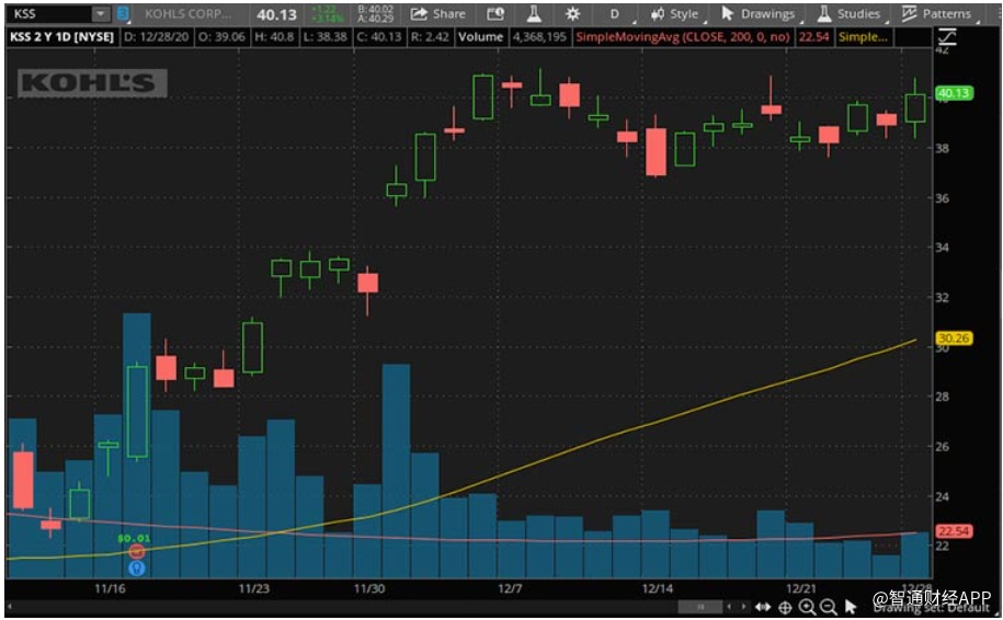 柯尔百货是一家百货连锁店,拥有1100多家分店,在美国除夏威夷以外的每个州都有分店。自1998年以来,该公司一直是标普500指数的成分股。柯尔百货也是2019年美国销售额第二大的百货连锁店,仅落后于梅西百货(M.US)。自今年三月份以来,柯尔百货的股价上涨了200%以上。