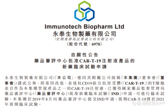 12月28日,永泰生物-B(06978)正式宣布,公司经基因改造、表达抗CD19嵌合抗原受体("CAR-T-19")的T细胞并且作为集团管线产品之一的CAR-T-19注射液,已获得国家药品审评中心批准新药临床试验("IND")申请,可进行临床试验。公司预期CAR-T-19的临床试验将在2021年展开。