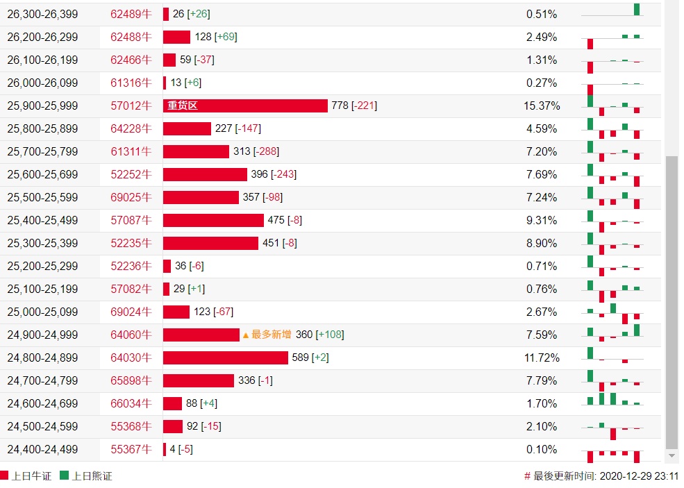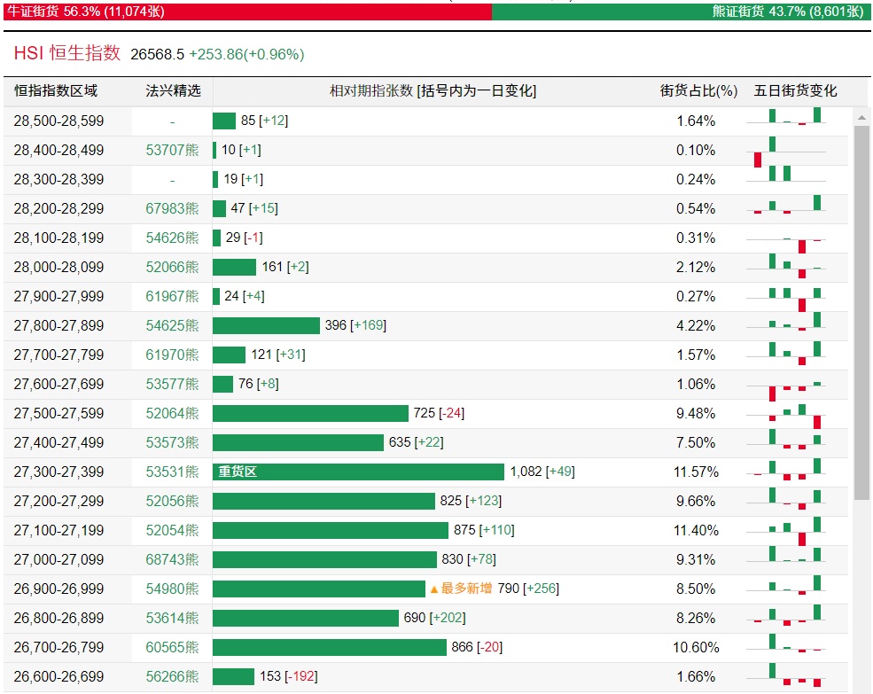 法兴恒指牛熊证街货分布图中的数据显示,熊证街货重货区在27300-27399区间,该区间最新熊证数量为1082张,较上一交易日增加49张;最多新增在26900-26999区间,该区间最新熊证数量为790张,较上一交易日增加256张。牛证街货重货区在25900-25999区间,该区间最新牛证数量为778张,较上一交易日减少221张。最多新增在24900-24999区间,该区间最新牛证数量为360张,较上一交易日增加108张。