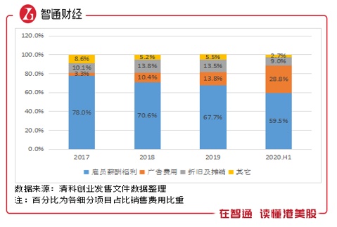 智通财经APP了解到,2017-2019年期间,清科创业销售费用率一直处于下降趋势,2019年为6.2%,相比于2017年下降了2.1个百分点,2020年受疫情影响,线下活动受到了阻碍,增加了较大的广告费用,费用率上升至14.1%。从销售费用构成看,按计划雇员薪酬比率将得到提升。