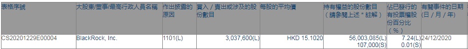 智通财经APP获悉,香港联交所最新资料显示,12月24日,贝莱德增持金风科技(02208)303.76万股,每股作价15.1020港元,总金额约为4587.38万港元。增持后最新持股数目约为5600.31万股,最新持股比例为7.24%。