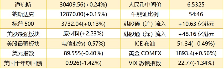 1、 隔夜美股截至收盘,道琼斯指数涨73.89点,涨幅0.24%,报30409.56点;标普500指数涨5点,涨幅0.13%,报3732.04点;纳斯达克综合指数涨19.78点,涨幅0.15%,报12870.00点。港股ADR指数下挫,按比例计算,收报26981点,跌166.26点或0.62%。