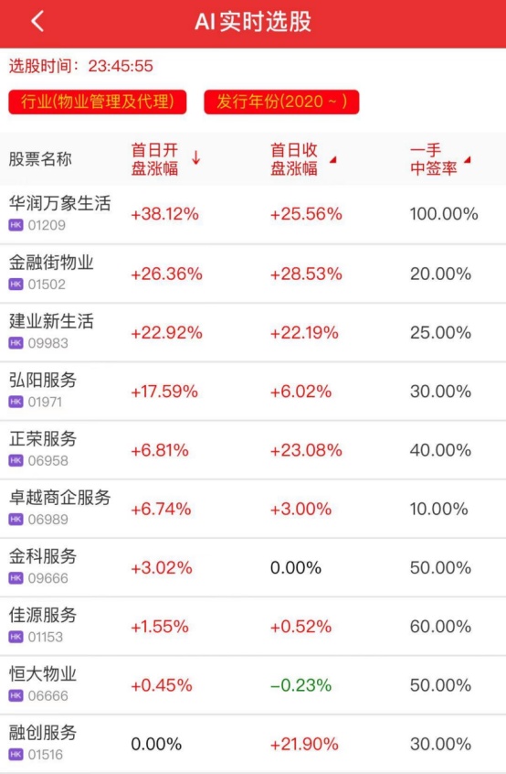 *图为利弗莫尔证券AI实时选股-2020年-港股打新股物业管理新股首日上市开盘、收盘涨幅数据