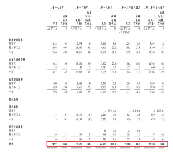宋都服务的物业管理服务毛利由2017财年的人民币1250万元增加至2019财年的人民币2010万元,并由2019年首六个月的人民币920万元增加至2020年首6个月的人民币1230万元,毛利率维持相对稳定,分别为20.9%、20.3%、21.0%、20.3%及20.7%。非业主增值服务毛利由2017财年的人民币420万元增加至2019财年的人民币1960万元,主要由于交付前服务、销售辅助服务及咨询服务的毛利率上升。