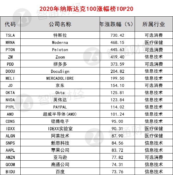截止12月30日,标普500指数今年涨15.52%。涨幅榜中,科技股依然是2020年上涨主力,其中,特斯拉(TSLA.US)以涨幅730.42%占据榜首,科技股方面,英伟达(NVDA.US)、AMD(AMD.US)均为翻倍行情,苹果(AAPL.US)涨83.72%、亚马逊(AMZN.US)涨77.82%,分别位居榜单第17位和19位。此外,高通(QCOM.US)涨74.31%、推特(TWTR.US)涨69.52%、奈飞(NFLX.US)涨62.13%等。