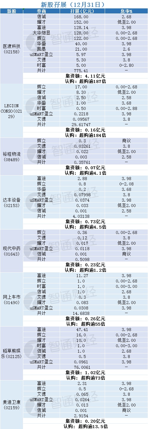 智通财经APP获悉,医渡科技(02158)、LEGION CONSO(02129)、裕程物流(08489)、达丰设备(02153)、现代中药(01643)、网上车市(01490)、稻草熊娱乐(02125)及麦迪卫康(02159)正在招股中。截至12月31日,辉立、耀才、信诚等合计分别为其借出775.41亿港元、29.61747亿港元、0.35761亿港元、4.03138亿港元、0.5098亿港元、14.6838亿港元、76.0061亿港元及2.9154亿港元。其中医渡科技超购逾187倍、LEGION CONSO超购逾184倍、裕程物流超购逾4.1倍、达丰设备超购逾4.5倍、现代中药超购逾1.2倍、网上车市超购逾55倍、稻草熊娱乐超购逾73倍及麦迪卫康超购逾13.5倍。