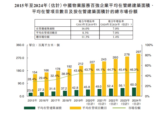 在这个即将迈入万亿规模的物业赛道中,中指院数据披露,中国物业服务百强企业的建筑面积和物业数量也呈快速增长的态势——中国物业服务百强企业平均总在管建筑面积从2015年的23.6百万平方米增至2019年的42.8百万平方米,复合年增长率为 16.0%;在管项目的平均数量从截至2015年的154项增至2019年的212项,复合年增长率为8.3%。