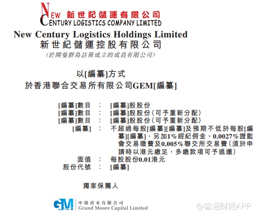 智通财经APP获悉,据港交所12月31日披露,新世纪储运控股有限公司(以下简称“新世纪储运”)再次向港交所创业板递交上市申请,中毅资本为其独家保荐人。
