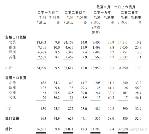 公司于2019财年、2020财年及截至2020年9月30日止六个月,来自货运代理服务的毛利分别约为3653.1万港元、3707.1万港元及3262万港元。2020财年来自货运代理服务的毛利增加由于向北美的空运出口货运毛利增加约530万港元,但被向欧洲、亚洲及其他地区的空运出口货运毛利分别减少约250万港元、110万港元及100万港元所抵销的合并影响所致。截至2020年9月30日止六个月来自货运代理服务的毛利增加,主要由于空运出口货运应占毛利由截至2019年9月30日止六个月的约1400万港元增加至截至2020年9月30日止六个月的约3190万港元。