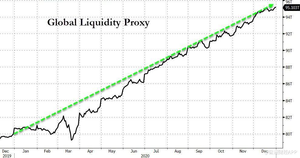 分析师指出,2020年全球股市的新增市值是一个很巧合的数字,因为2020年全球流动性飙升了15万亿美元左右。
