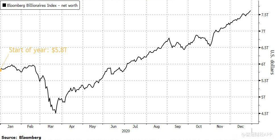 当世界大部分地区都在努力应对失业率飙升和经济增长放缓时,世界上0.001%的人受益于这个前所未有的财富创造时期。数据显示,2020年全球500名最富有的人的净资产合计增加了1.8万亿美元,总额达到7.6万亿美元,相当于增长了31%,这是该指数在8年来最大的年度涨幅,也比3月份的市场最低点跃升了3万亿美元。