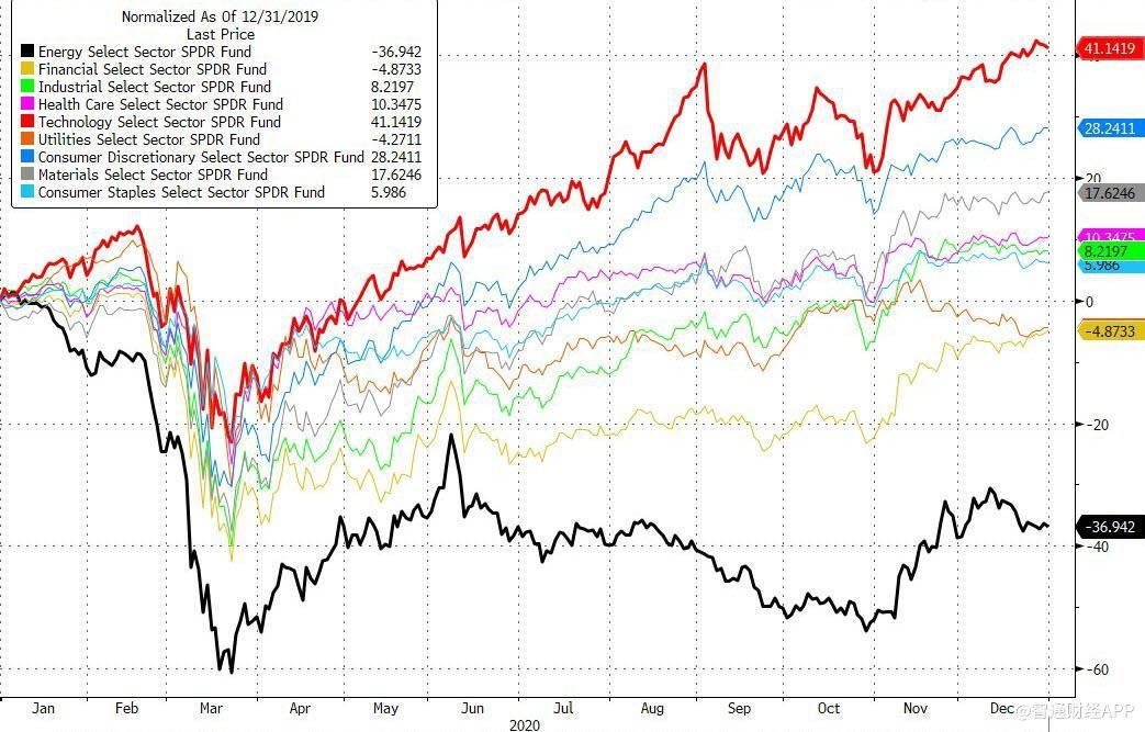 科技股在3月最低点时下跌超过20%后,2020年暴涨超过40%。能源股遭受暴击,在2020年下跌超过35%。