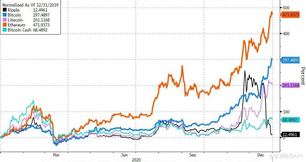 比特币飙涨(年内涨幅约300%,时2017年以来最好的一年),但以太坊才是2020年最大的赢家,涨幅超过470%(而瑞波币最近的崩盘是加密历史上最大的崩盘之一)。