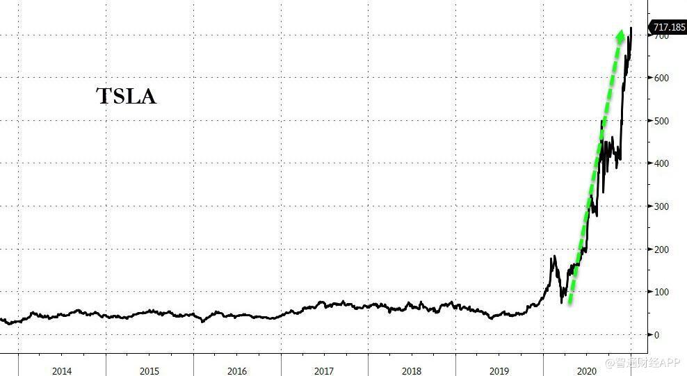 当然,加密货币今年的暴涨绝对是泡沫,但特斯拉(TSLA.US)的745%暴涨是有“基本面支撑”的(至于是否真的有基本面支撑得靠个人想象)。特斯拉完全主导了2020年,在华尔街交易的每一美元中,有6.6美分给了这家汽车制造商。