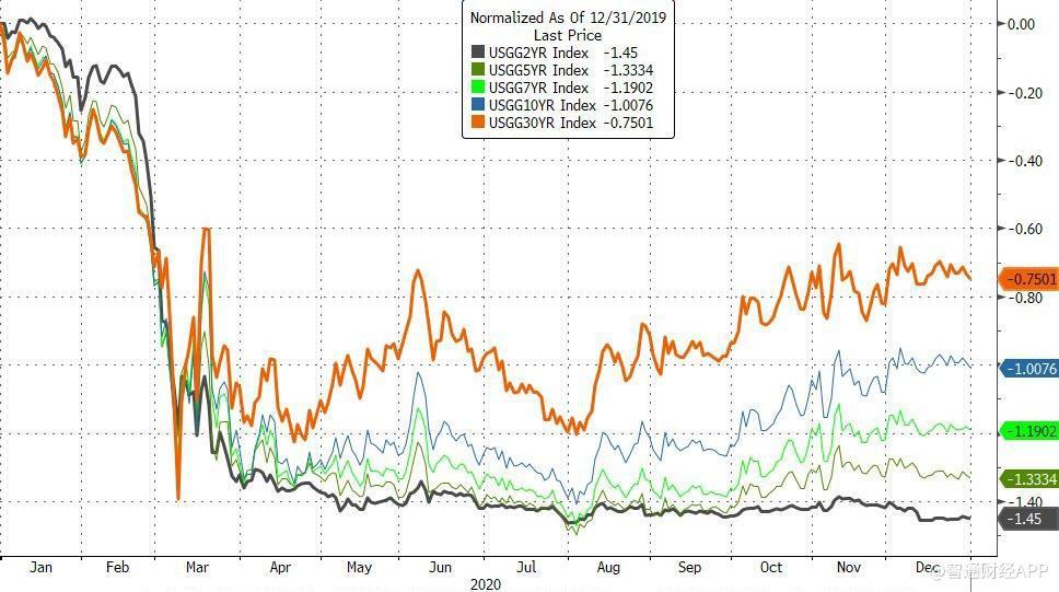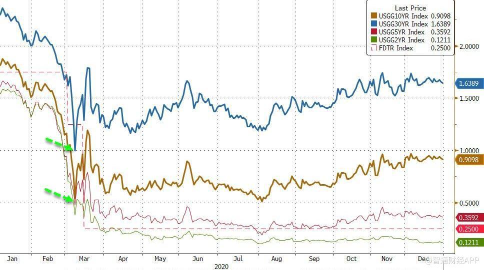 美国国债收益率在2020年崩盘,虽然长端确实有所回升,年内仍下跌75个基点(这是2014年以来收益率的最大年跌幅)。