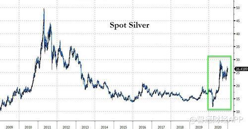 虽然黄金创下新高,白银在2020年涨幅较大,但仍远低于2011年的高点。