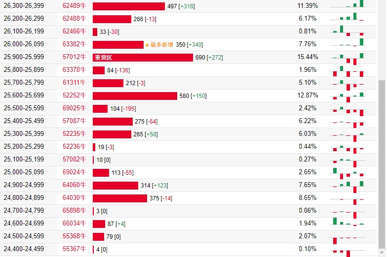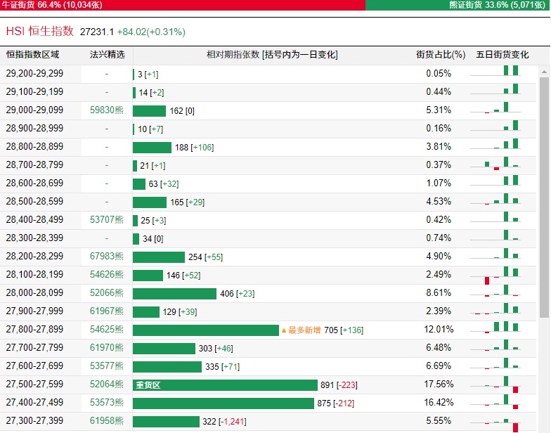 法兴恒指牛熊证街货分布图中的数据显示,熊证街货重货区在27500-27599区间,该区间最新熊证数量为891张,较上一交易日减少223张;最多新增在27800-27899区间,该区间最新熊证数量为705张,较上一交易日增加136张。牛证街货重货区在25900-25999区间,该区间最新牛证数量为690张,较上一交易日增加272张。最多新增在26000-26099区间,该区间最新牛证数量为350张,较上一交易日增加340张。