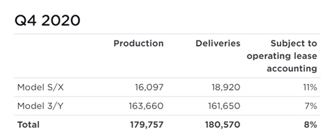 2020年全年交付了499550辆,较2019年的36.75万辆增加了36%,但与年初定下的50万辆微有差距。不过,特斯拉表示,其交付数量数字略显保守,最终数字的差异可能高达0.5%或更多。