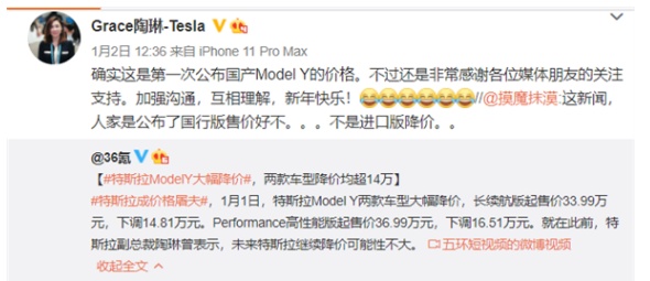 新年第一天,国产Model Y正式公布售价:长续航版起售价33.99万元(单位为人民币,下同,约合5.2万美元),下调14.81万元。Performance高性能版起售价36.99万元,下调16.51万元(较进口版)。