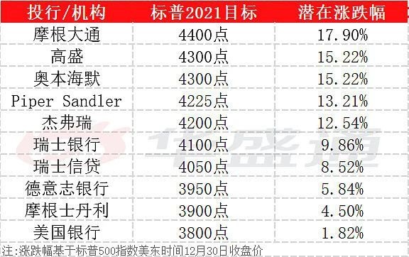 明年的美股到底还能不能涨?这或许是很多投资者相当关心的一个话题。从现有机构的预测来看,摩根大通给出的目标价最高,标普将上涨至4400点,潜在涨幅为17.9%;美国银行给出的目标价最低,标普将上涨1.82至3800点。