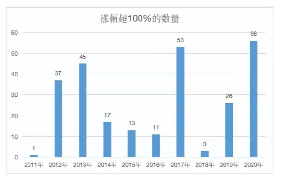 2017年又迎来赚钱的黄金时段,2018年却只有3只股票翻番,大多数人在2018年都处于一个亏损状态。进入2019年,我们又进入一个赚钱容易的阶段,2020年更是表现炸裂。