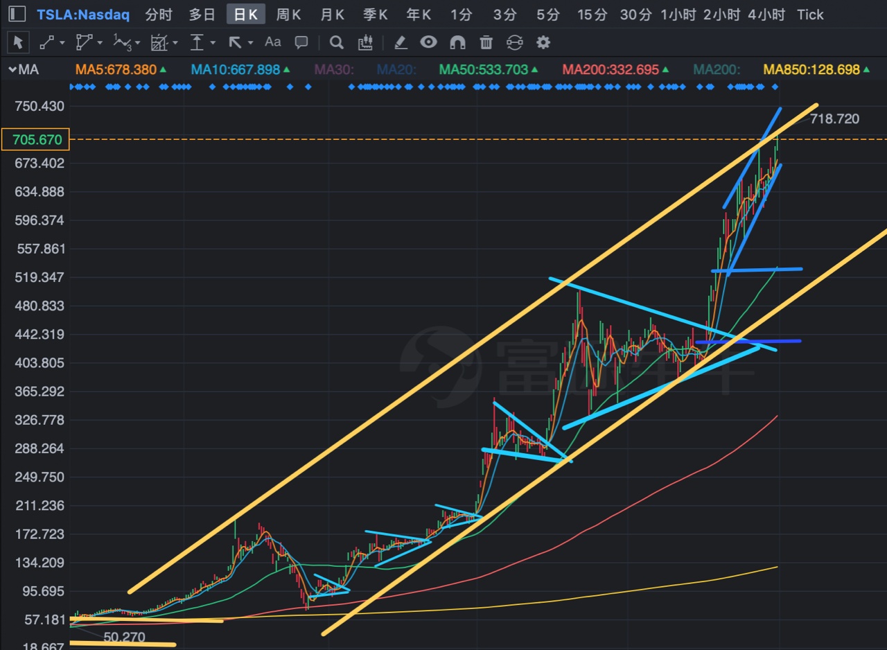 特斯拉股价在短短一个月时间,从400美元上涨到了700美元,这么大的体量,基本面没什么变化的情况下,只因为进入标普500指数涨这么多,涨幅真的不小了,所以我非常担心特斯拉下周会冲高回落带崩大盘。因为从技术形态去分析,特斯拉很可能将会在接下来一段时间回撤至540美元。