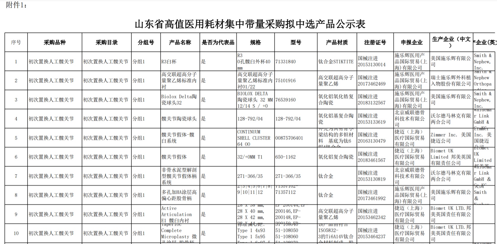 12月31日,山东省公共资源交易网发布《关于公示山东省高值医用耗材集中带量采购拟中选结果的通知》显示: