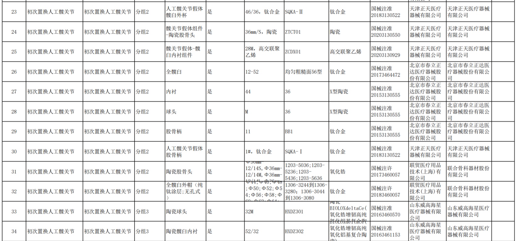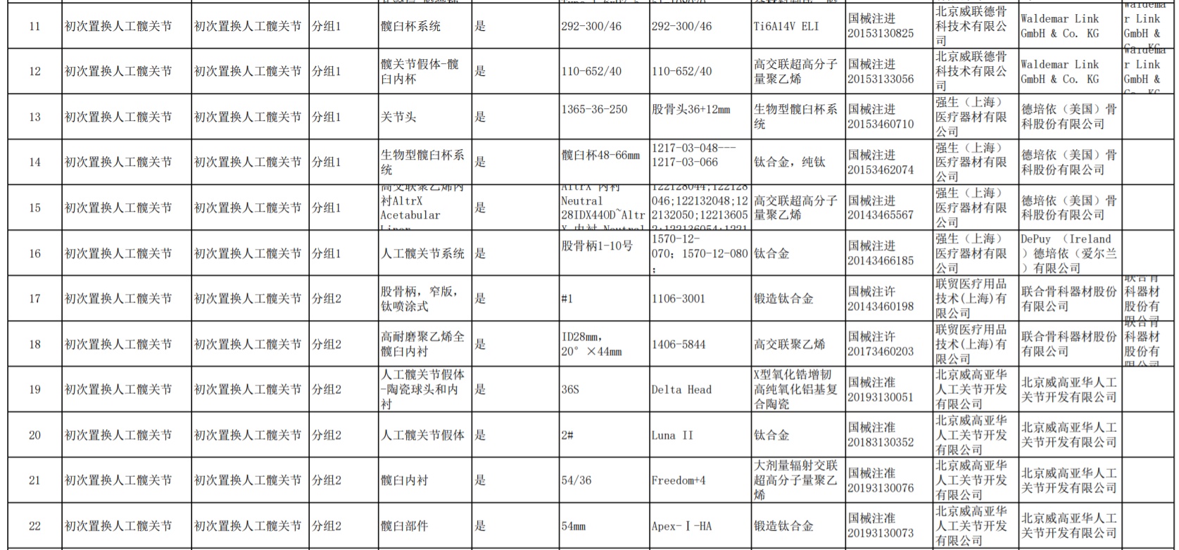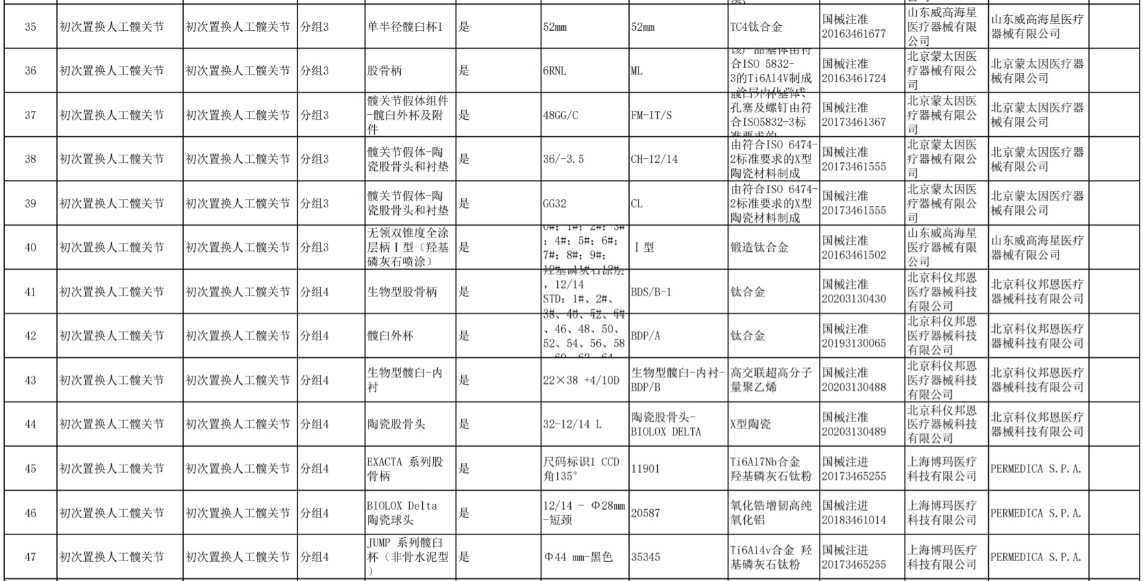 初次置换人工髋关节拟中选械企包括强生、施乐辉、捷迈、威高、春立正达等;