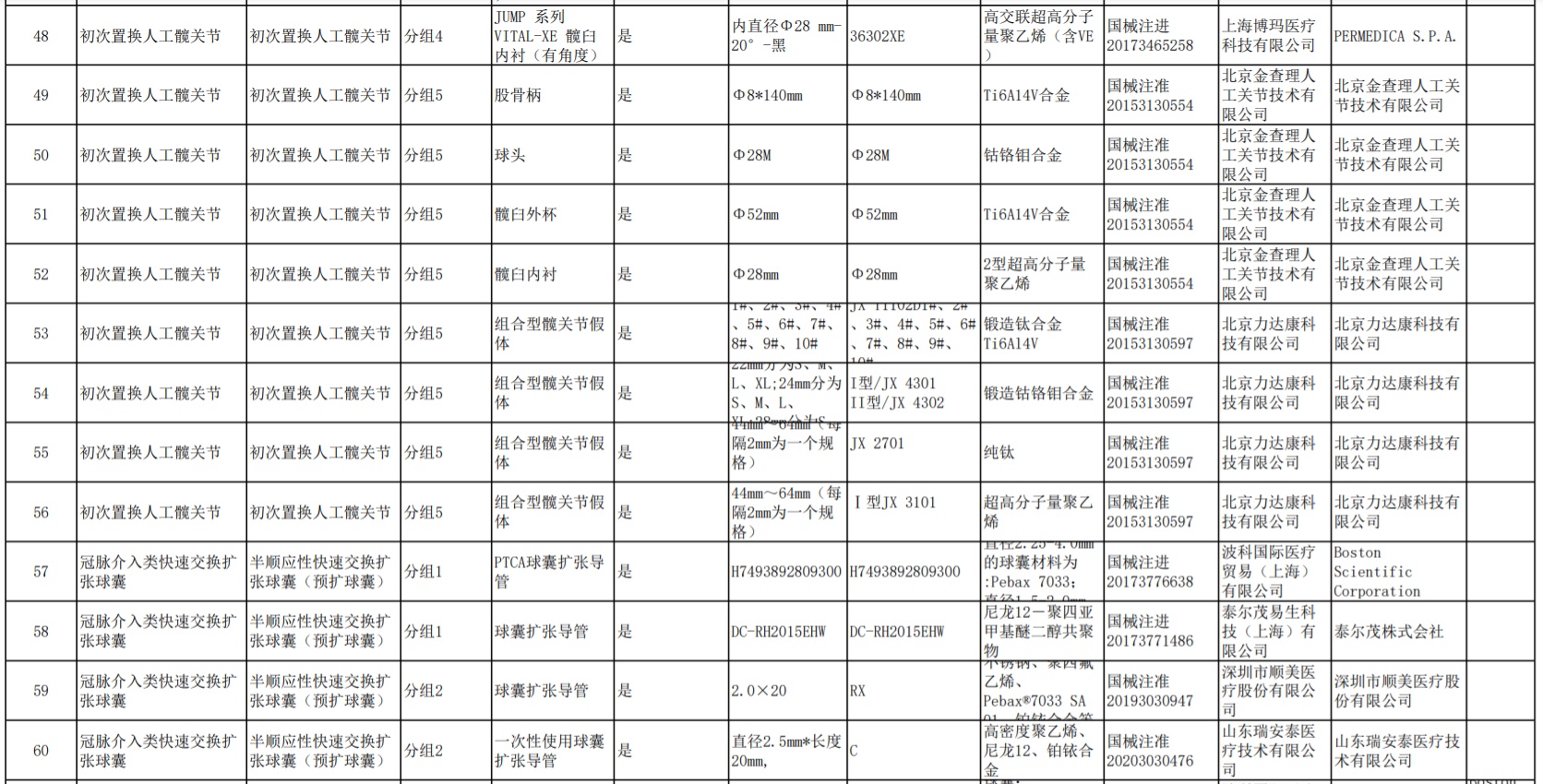 根据人民网消息,2020年12月31日,山东省5类高值医用耗材集中带量采购产生拟中选结果,包含冠脉介入类快速交换球囊、初次置换人工髋关节、可吸收硬脑(脊)膜补片、一次性使用套管穿刺器、心脏起搏器(双腔)等5类耗材品种。