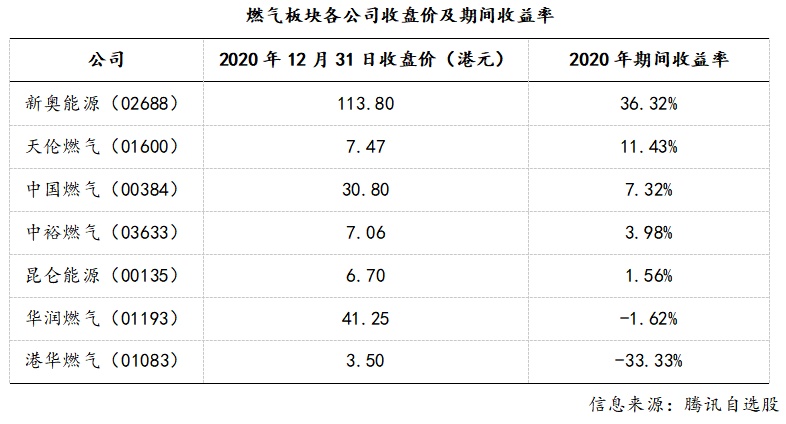 冷冬来袭,天然气需求旺季已经到来,近期天然气板块持续走强,多只燃气股股价连续保持攀升态势。根据腾讯自选股的统计数据显示,2020年全年新奥能源(02688)的期间股票表现增幅36.3%,收盘价至113.80港元,紧随其后的天伦燃气(01600)期间股票表现增幅11.4%,收盘价达到阶段性新高至7.47港元,其他多只燃气股亦实现正向增长的期间收益率。各大行也纷纷上调目标价。大和上周上调新奥至128元。而三家机构同时提高天伦燃气目标价,其中星展银行目标价升至8.40港元,安信国际提至8.10港元,中金公司升至8.00港元。