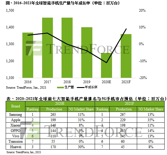 TrendForce集邦咨询表示,2020全球智能手机市场受到公共卫生事件冲击,全年生产总量仅12.5亿部,同比减少11%,为历年来最大衰退幅度。而全球前六大品牌排名依序为三星、苹果(AAPL.US)、华为、小米(01810)、OPPO以及Vivo。