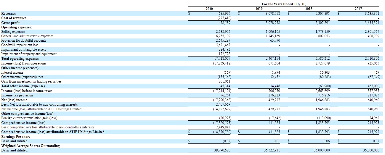智通财经APP获悉,亚洲时代(ATIF.US)于12月31日向SEC递交了20F报告,披露了公司截至2020年7月31日的2020财年年报和最新股权结构,其中公司2020财年营收为68.60万元(美元,下同),净亏损为1729.04万元。