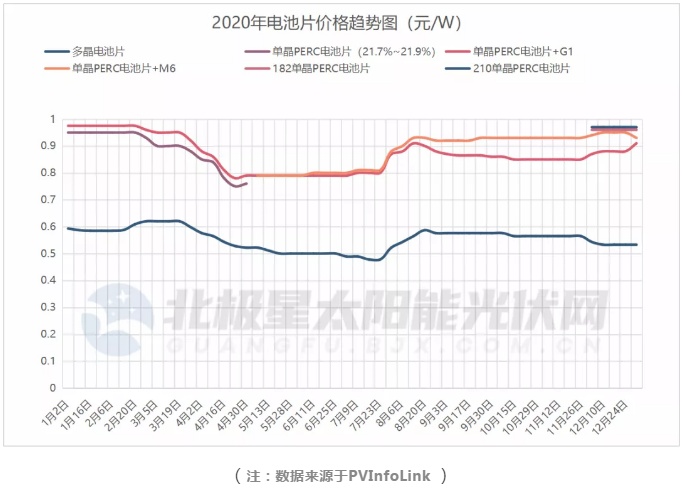电池片环节,多晶电池片由0.576元/W降至0.5元/W,降幅13%,较年初降幅16%;G1单晶PERC电池片由0.88元/W降至0.79元/W,降幅10%,较年初降幅19%。