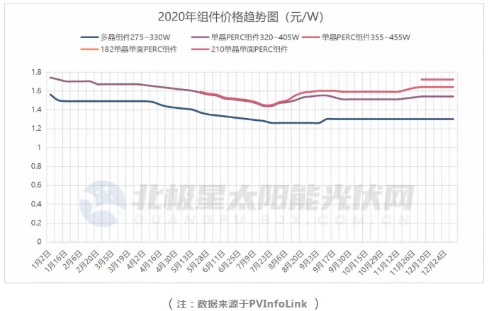 组件环节,多晶组件(275~330W)由1.49元/W降至1.33元/W,降幅11%,较年初降幅15%;单晶PERC组件(320~405W)由1.66元/W降至1.52元/W,降幅8%,较年初降幅13%。