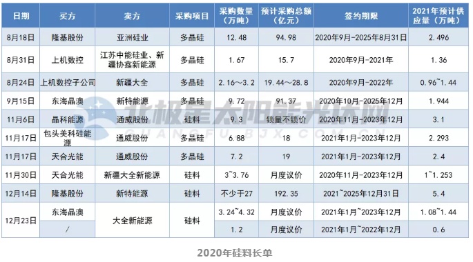 上游疯长、下游催货,颇受夹板气的组件企业开始接连扩充短板,加固垂直一体化,此外长单模式再次回归,抢硅料、抢玻璃,签约不断。据北极星太阳能光伏网统计,2020年下半年,亚洲硅业、江苏中能&新疆协鑫新能源(00451)、新疆大全、通威股份、新特能源(01799)5大硅料巨头已签出86.73万吨硅料;福莱特、亚玛顿、南玻A、彩虹新能源(00438)签出270亿元玻璃合同。