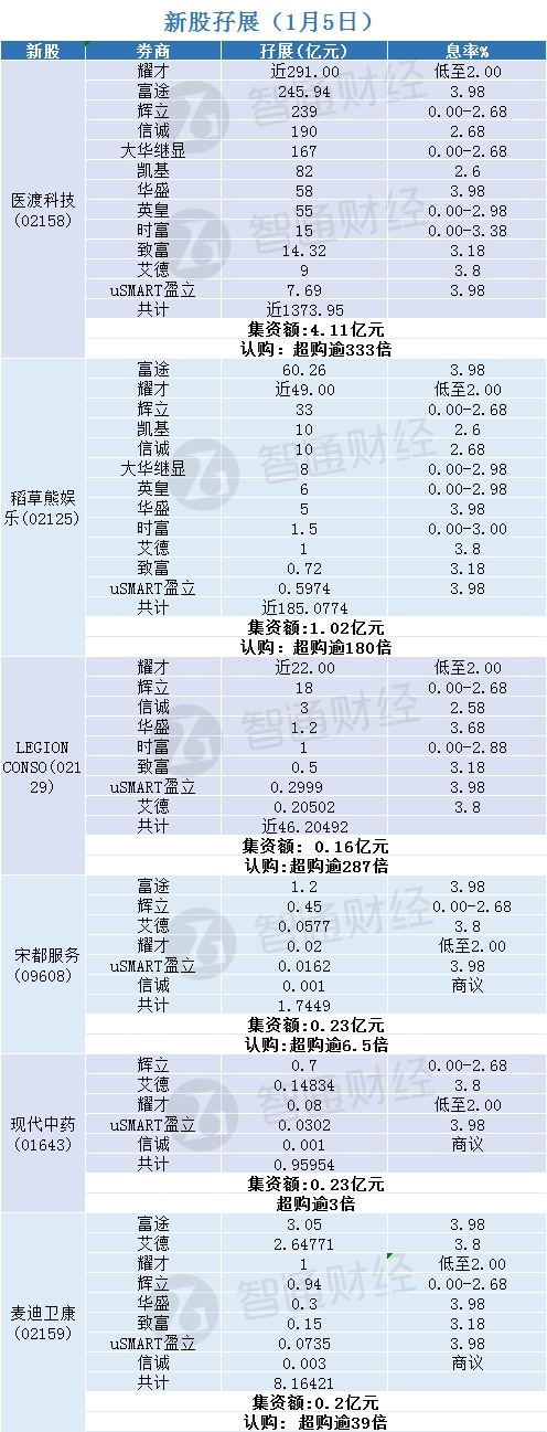 智通财经APP获悉,医渡科技(02158)、稻草熊娱乐(02125)、LEGION CONSO(02129)、 宋都服务(09608)、现代中药(01643)及麦迪卫康(02159)正在招股中。截至1月5日,医渡科技超购逾333倍、稻草熊娱乐(02125)超购逾180倍、LEGION CONSO超购逾287倍、宋都服务超购逾6.5倍、现代中药超购逾3倍、麦迪卫康超购逾39倍。