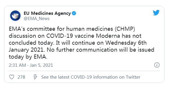 当地时间1月5日,欧洲药品管理局在推特上表示,EMA人类药物委员会(CHMP)就Moderna疫苗的讨论到今天还未结束,周三将继续讨论,今天将不会发布进一步的消息。