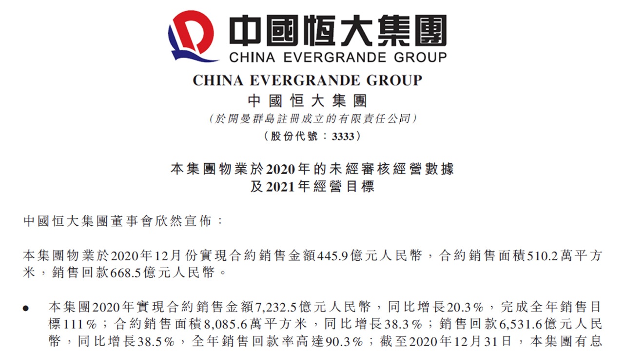 随着2021跨年的钟声敲响,不平凡的2020正式收官。辞旧迎新之际,中国恒大(03333)则交出了一份靓丽的成绩单。