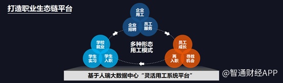 从学生在校实习开始、毕业找工作、入职,到企业多种灵活用工模式服务、到员工职业成长、培训、发展找机会、再就业,建立一条整体职业生态链服务。在这背后就是人瑞人才大数据系统支撑,在线、数据、智能算法,支撑整条生态链,形成闭环。