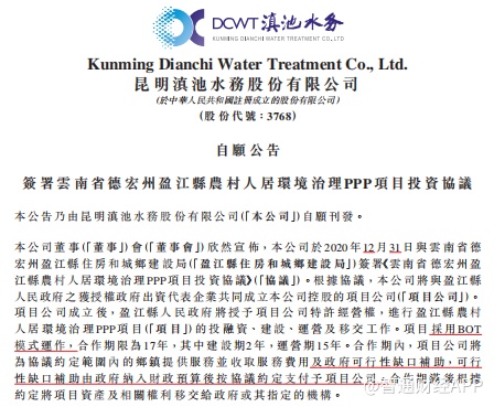 智通财经APP观察到,2020年12月31日,滇池水务(03768)发布公告称,公司与云南省德宏州盈江县住房和城乡建设局签署《云南省德宏州盈江县农村人居环境治理PPP项目投资协议》。