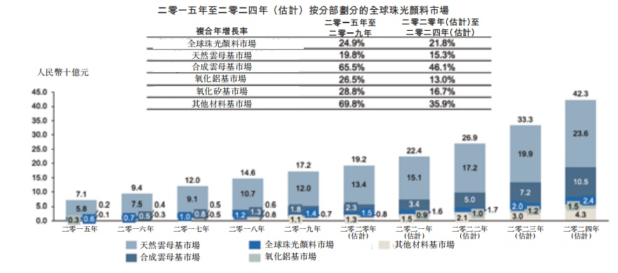 智通财经APP了解到,过去几年,全球珠光颜料市场呈现稳定增长态势,于2019年达到172亿元,于2015年至2019年的复合年增长率为24.9%。随着消费升级及珠光颜料逐渐取代其他颜料,弗若斯特沙利文预计2020年至2024年全球珠光颜料市场的复合年增长率为21.8%,于2024年将达到423亿元。