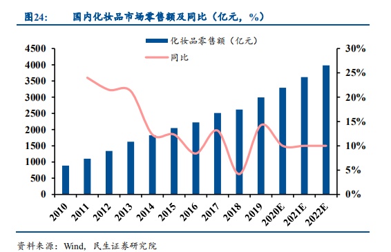 据民生证券研报显示,珠光材料下游行业中,化妆品增速最快,2010-2019年化妆品市场年复合增长率约14%,2022年国内化妆品市场零售额可突破3983亿元,预计这一零售额可继续带动珠光材料放量。汽车领域方面,2020-2022年全球汽车级珠光材料市场空间可达21亿元、22亿元和24亿元。