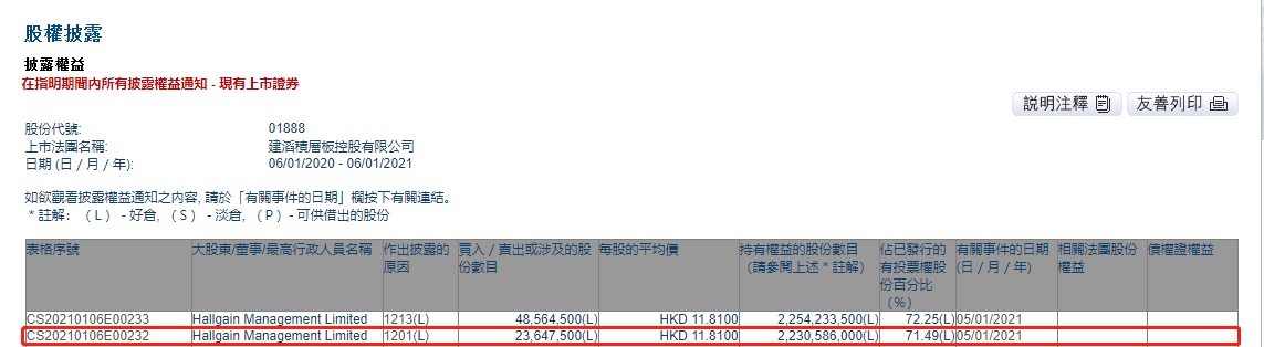 智通财经APP获悉,根据香港联交所资料显示,Hallgain Management Ltd于1月5日减持建滔积层板(01888)2364.75万股,每股作价11.81港元,总值约2.79亿港元,最新持股数目约22.3亿股,最新持股比例减至71.49%。