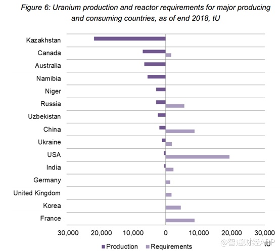 目前全球已探明铀矿呈现较为集中的态势。截至2019年,全球探明铀矿资源主要分布在澳大利亚、哈萨克斯坦、加拿大等,CR3占比超过50%,产量方面哈萨克斯坦、加拿大、澳大利亚排名前三。核电作为铀燃料最主要的需求,占总需求的 95%。2018年全球铀需求量美国、法国、中国排名前三。