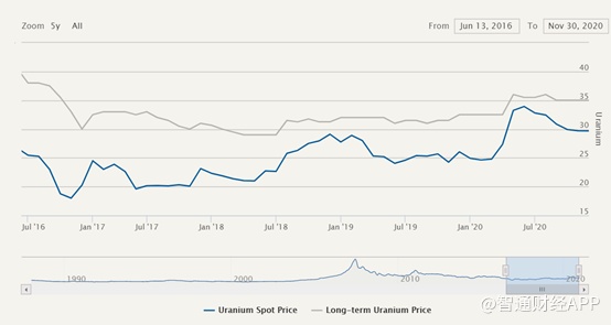一方面是因为,铀的供给方变得集中,龙头企业也在主动减产甚至关停某些矿山,以保证铀价稳定。另一方面,2020年受到公共卫生事件影响,加速了行业产能出清,部分矿厂减产、停产,铀期货和现货价格提高。
