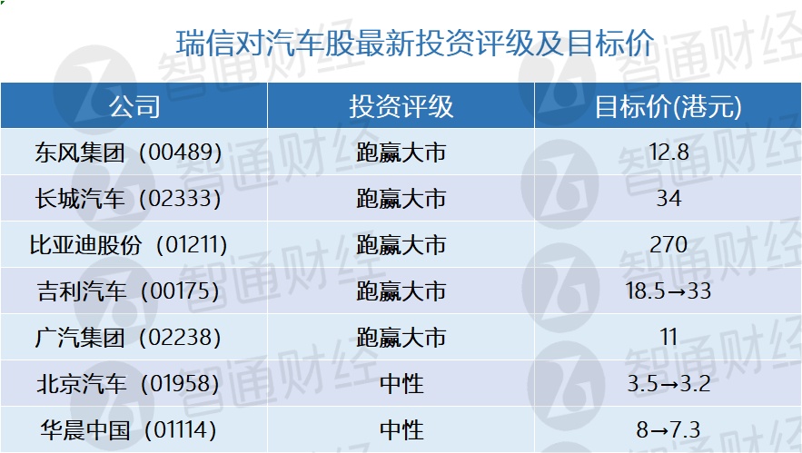 该行对行业推荐依次为:东风集团股份(00489)、蔚来公司、小鹏汽车、理想汽车、长城汽车(02333)、比亚迪股份(01211)、吉利汽车(00175)、广汽集团(02238)、北汽(01958)和华晨中国(01114)。该行将吉利目标价由18.5港元上调至33港元,北汽及华晨目标价则分别由3.5港元、8港元,降至3.2港元及7.3港元。