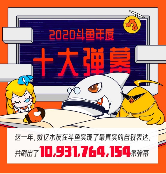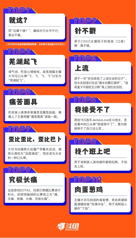 2021年1月6日,国内领先的游戏直播平台斗鱼(DOYU.US)发布了2020年度十大弹幕。“‘就这?’、针不戳、芜湖起飞、上流、痛苦面具、我接受不了、‘歪比歪比、歪比巴卜’、找个班上吧、究极长痛、肉蛋葱鸡”当选年度弹幕TOP10。据统计,斗鱼水友2020年共计发送了超过109亿条弹幕,其中“就这?”发送超过4000万次。