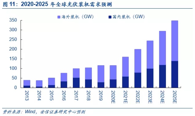 综合来看,我们维持对于2021年全球光伏新增装机160-170GW(国内50-60GW,海外100-110GW),2021年国内风电装机30GW左右的判断。