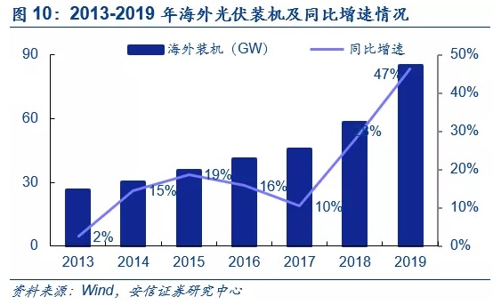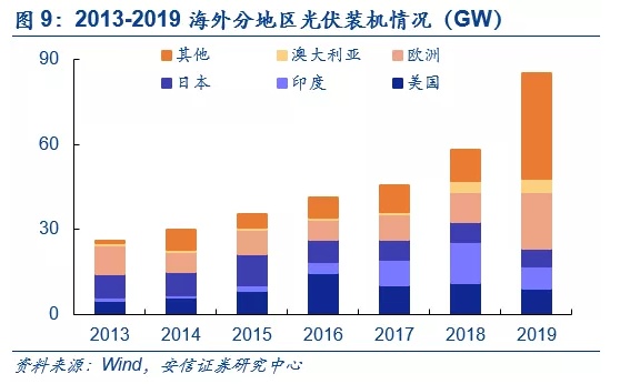 海外光伏装机去中心化,需求增长确定性强。随着全球GW级市场的增多,海外光伏装机需求正在逐渐去中心化。2019年欧洲、美国、日本等传统光伏市场新增装机占比逐步下滑,前五大市场新增装机占比仅为56%。伴随去中心化到来的,是单一市场对海外装机需求的扰动被逐渐平滑,海外光伏新增装机需求增长变得愈发确定。